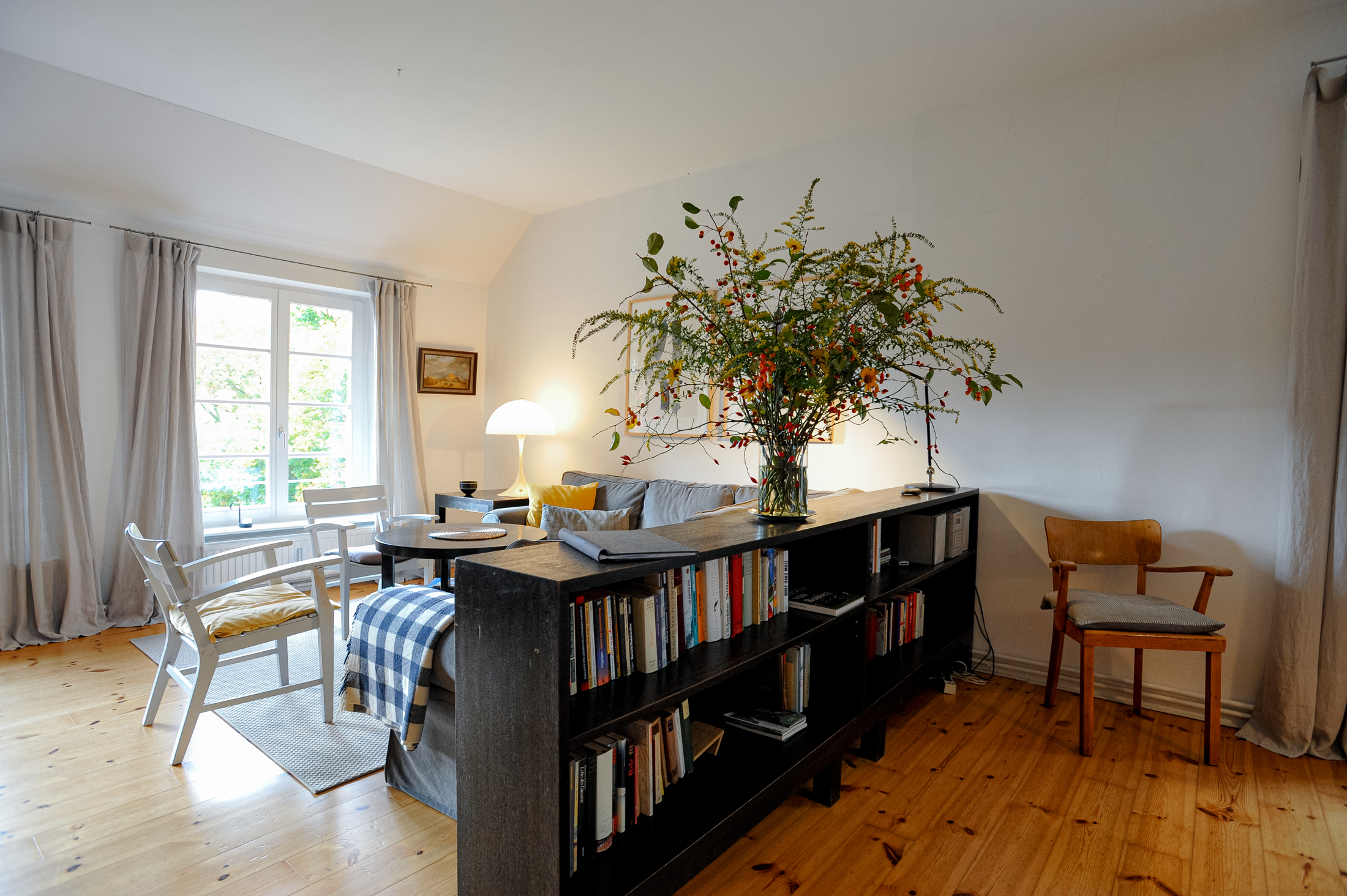 Luftig und licht, mit Blick Richtung Dorf und in den alten Obstgarten, bietet die Wohnung genug Platz, um sich auszubreiten. Die liebevoll gestaltete Ferienwohnung unterteilt sich in ein großes Wohn- und Esszimmer, mit einer voll ausgestatteten Küche. Im angrenzenden Schlafzimmer stehen ein Doppelbett und zwei Einzelbetten bereit – ideal für Familien oder Pärchen. Das separate Badezimmer verfügt über eine Badewanne. Eine gemütliche Sofaecke im Wohnbereich lädt zum Entspannen und Lesen ein.